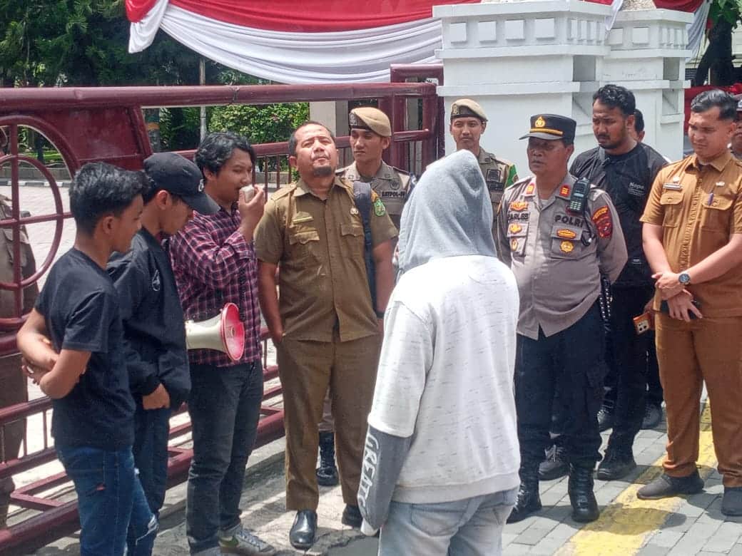 Aksi unjuk rasa damai dari Jaringan Mahasiswa Indonesia diterima staf Pemko Medan Moch Eka Indrawan Keliat.
