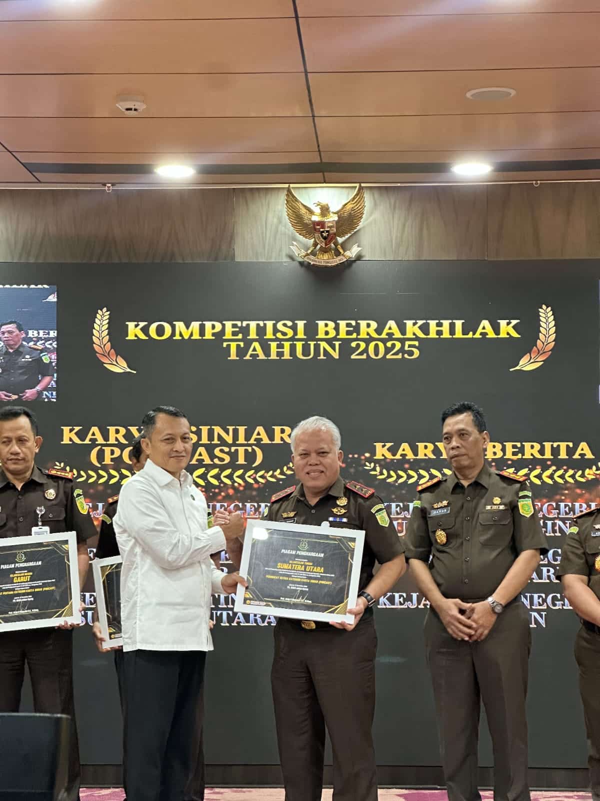 KejaksaanKejaksaan Tinggi Sumatera Utara dianugerahi penghargaan dan apresiasi sebagai peringkat ke-III satuan kerja (Satker) kompetisi berAKHLAK tahun 2025 yang diserahkan oleh Wakil Jaksa Agung Republik Indonesia Prof.Dr.Asep N Mulyana diwakili Jaksa Agung Muda Pengawasan (JAMWAS) Prof Dr Rudi Margono dan diterima langsung oleh Kajati Sumatera Utara Dr.Harli Siregar, SH.,M.Hum di Jakarta pada hari Rabu 17/12/2025.
