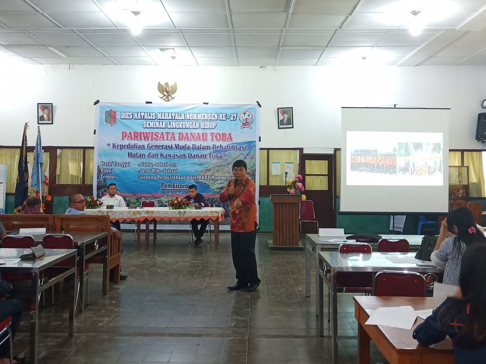 Unit Kegiatan Mahasiswa (UKM) Mahasiswa Pecinta Alam (Mapala) Mahatala Nommensen menggelar seminar Lngkungan Hidup dalam rangka Dies Natalis ke 27, bertajuk Parawisata Danau Toba, Sabtu (6/7/2019), di Gedung Perpustakaan Kampus Universitas HKBP Nommensen, Jalan Sutomo Medan.