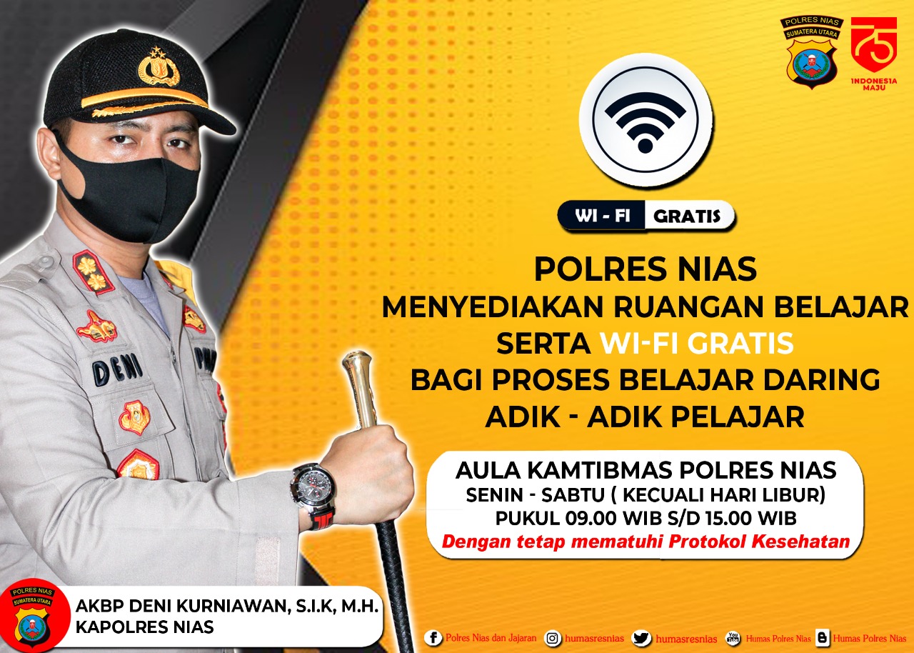 Kepolisian Resor Nias menyediakan ruangan belajar serta wifi gratis untuk belajar daring di Aula Mapolres Nias. Hal ini disampaikan Kapolres Nias AKBP Deni Kurniawan, S.I.K, MH, Senin (03/08) di Mapolres Nias.