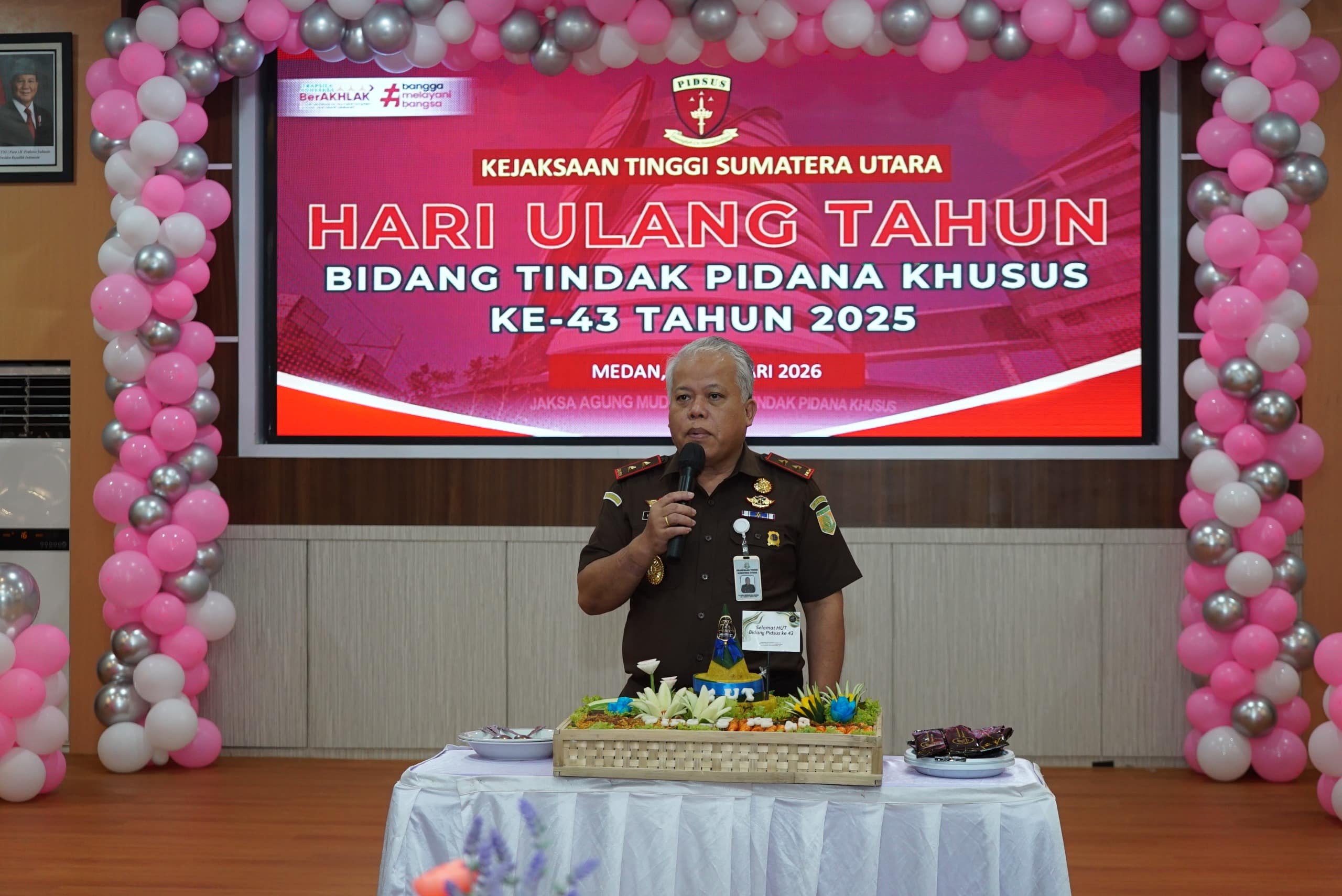 Kajati Sumatera Utara Dr.Harli Siregar, SH.,M.Hum bersama Wakajati Sumut Abdullah Noer Denny,SH.,MH beserta para pejabat utama (PJU), para koordinator, kepala Seksi serta para Jaksa Penyidik maupun Jaksa Fungsional dan jajaran bidang pidana khusus Kejati Sumut mengikuti peringatan hari ulang tahun ke-43 bidang pidsus Kejaksaan R.I tahun 2026 secara daring (zoom online) dari aula cipta kerta lantai III Kejati Sumatera Utara.