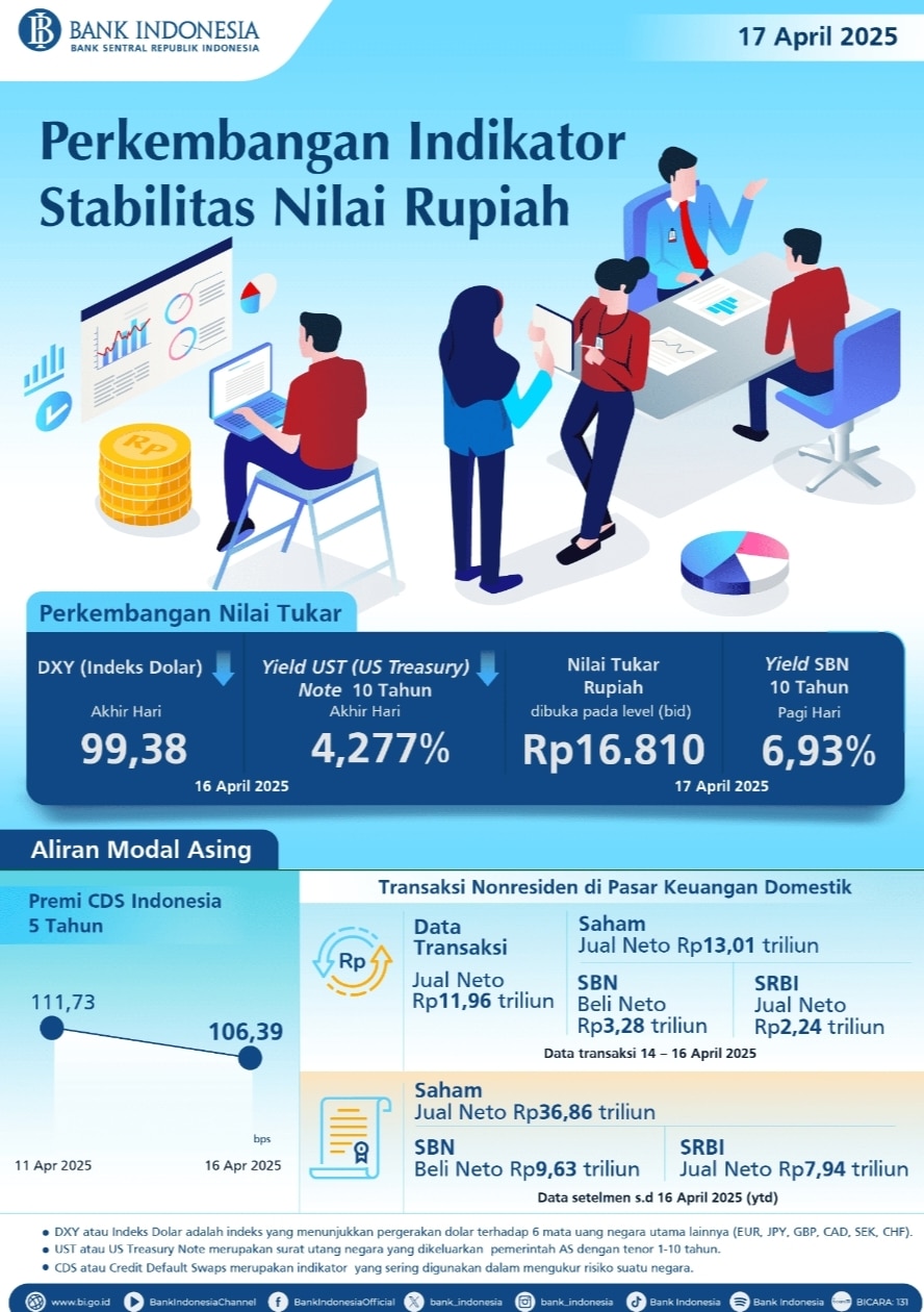 Selama tahun 2025, berdasarkan data setelmen s.d. 16 April 2025, nonresiden tercatat jual neto sebesar Rp36,86 triliun di pasar saham, beli neto Rp9,63 triliun di pasar SBN dan jual neto Rp7,94 triliun di SRBI.