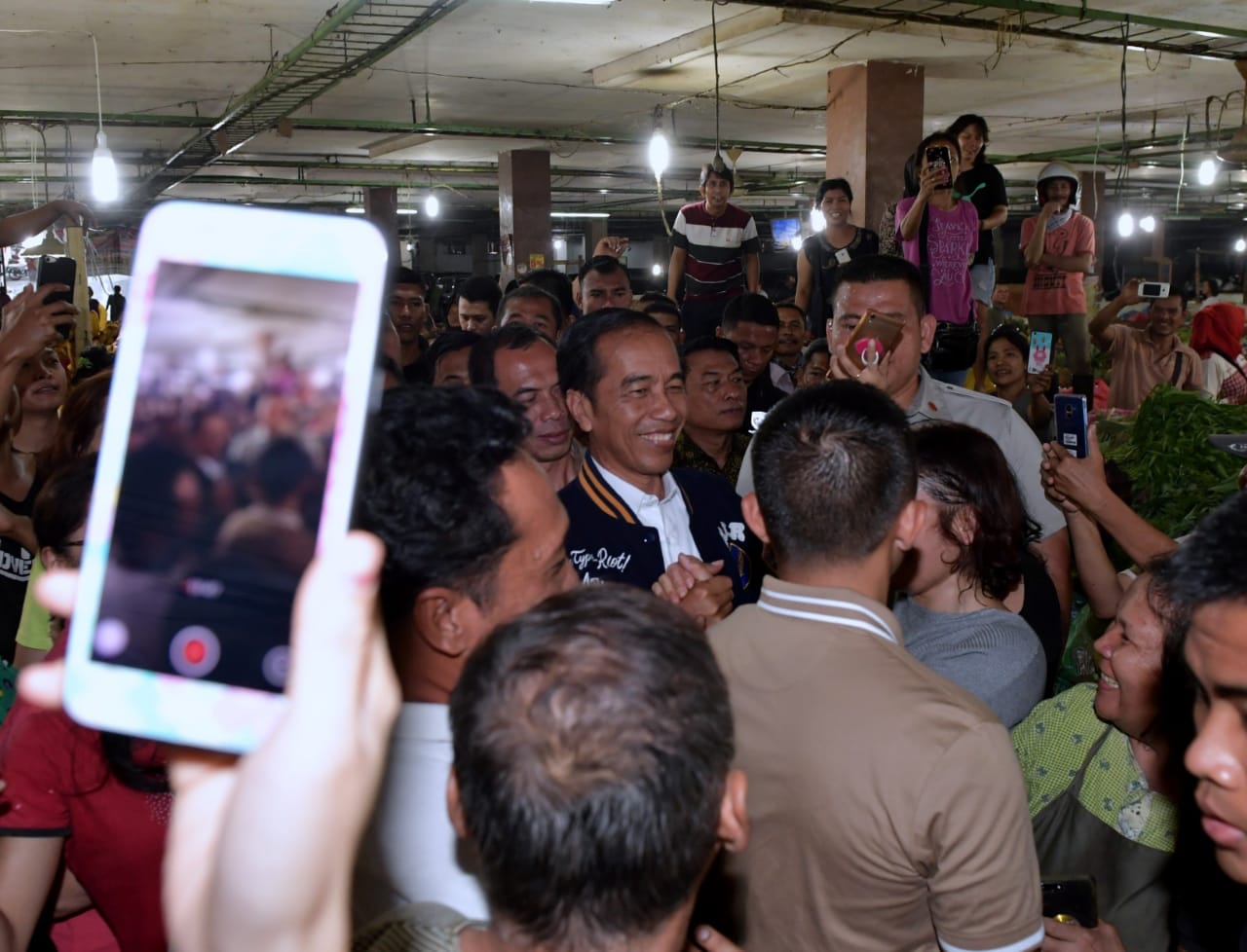 Tiba di pasar sekitar pukul 08.54 WIB, Presiden yang mengenakan jaket biru disambut riuh masyarakat. Para pedagang dan pembeli pun langsung mengerubutinya untuk bersalaman dan berswafoto.