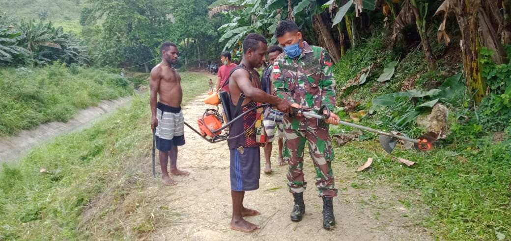Kopitimes – Satgas Pamtas RI-PNG Yonif Mekanis Raider 413 Kostrad ajarkan cara penggunaa menggunakan mesin rumput kepada masyarakat Kampung Gambut Distrik Muara Tami Kota Jayapura. (Jayapura, 10 Agustus 2020)