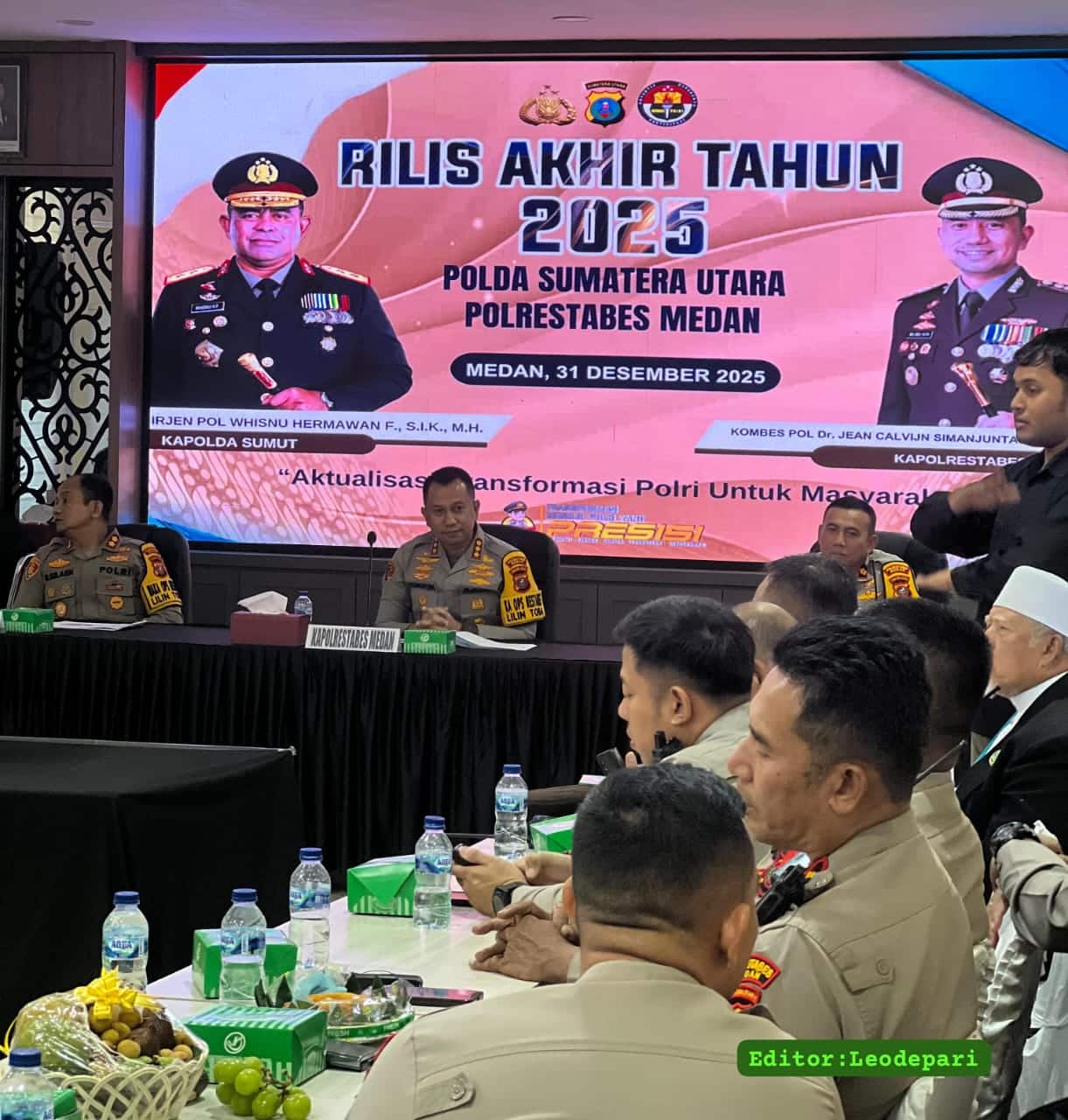 “Banyak faktor yang mempengaruhi menurunnya jumlah laporan yang kita terima di Polrestabes pada tahun ini. Mungkin ini dipengaruhi kegiatan-kegiatan pencegahan yang kita lakukan seperti, deteksi dini ada sekitar 356 kegiatan, Door To Door Sistem (DDS), 107.643 kegiatan, problem solving sekitar 415 kegiatan, bimbingan dan penyuluhan (Binluh), 43.010 kegiatan, Tiktok 4820 kegiatan, Satkamling 2.999 kegiatan, Go To School 346 kegiatan, Curhat Warga, 237 kegiatan, Jumat Barokah, 271 kegiatan, Minggu kasih, 256 kegiatan dan penyaluran beras SPHP 208 kegiatan,”jelas Kapolrestabes Medan, Kombes Pol Dr Jean Calvijn Simanjuntak, SIK, MH saat menggelar Rilis Akhir Tahun 2025, Rabu (31/12) di Aula Patriatama Mapolrestabes Medan.