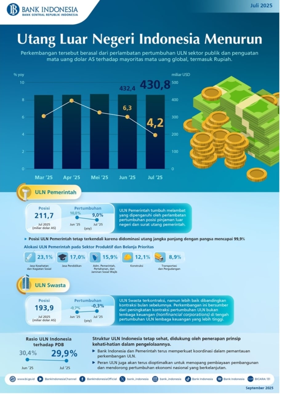 Struktur ULN Indonesia tetap sehat, didukung oleh penerapan prinsip kehati-hatian dalam pengelolaannya. Hal ini tecermin dari rasio ULN Indonesia terhadap Produk Domestik Bruto (PDB) yang turun menjadi 30,0% pada Juli 2025 dari 30,5% pada Juni 2025, serta dominasi ULN jangka panjang dengan pangsa 85,5% dari total ULN. Dalam rangka menjaga agar struktur ULN tetap sehat, Bank Indonesia dan Pemerintah terus memperkuat koordinasi dalam pemantauan perkembangan ULN. Peran ULN juga akan terus dioptimalkan untuk menopang pembiayaan pembangunan dan mendorong pertumbuhan ekonomi nasional yang berkelanjutan. Upaya tersebut dilakukan dengan meminimalkan risiko yang dapat memengaruhi stabilitas perekonomian.